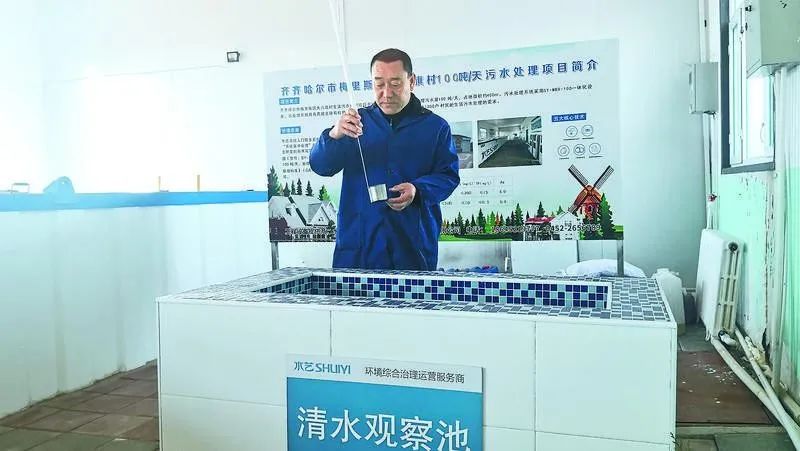 △村里污水廠內(nèi),工作人員在查看水質(zhì)
